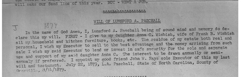 Ann C PASCHALL was born in Nov 1850 in Granville, North Carolina. She died on 29 May 1928 in Wake, NC.[Notes]