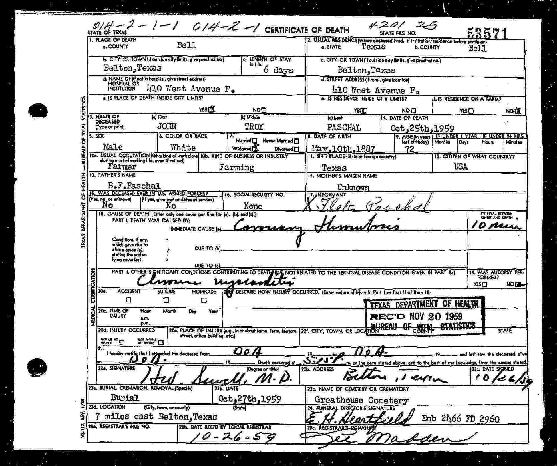 John Troy PASCHALL [scrapbook] was born on 10 May 1887 in Montague, Texas. He died on 25 Oct 1959 in Bell, Texas.[Notes]