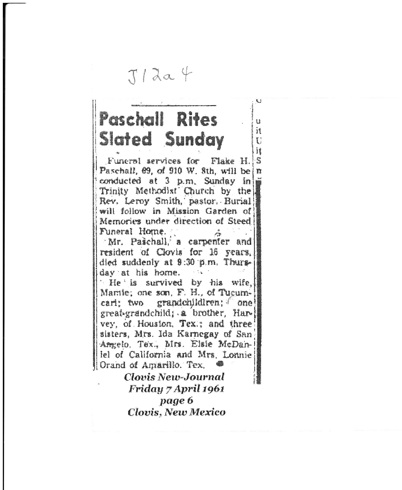 Flake H PASCHALL [scrapbook] was born on 5 Mar 1892 in Montague, Texas. He died on 7 Apr 1961 in Curry, New Mexico.[Notes]