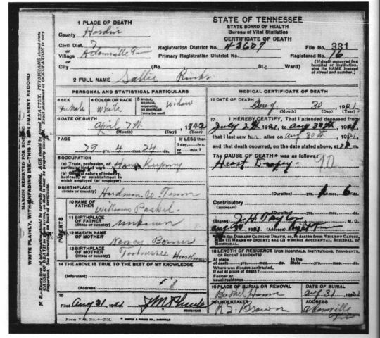 Sarah Rinks, death cert
